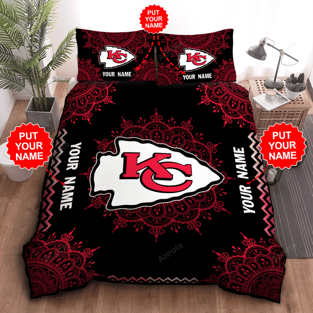 Show off your solid team spirit with our Kansas City Chiefs Mandala Custom Black Bedding Set. Made for the die-hard fans, this set will fill your dreams with Chiefs pride.