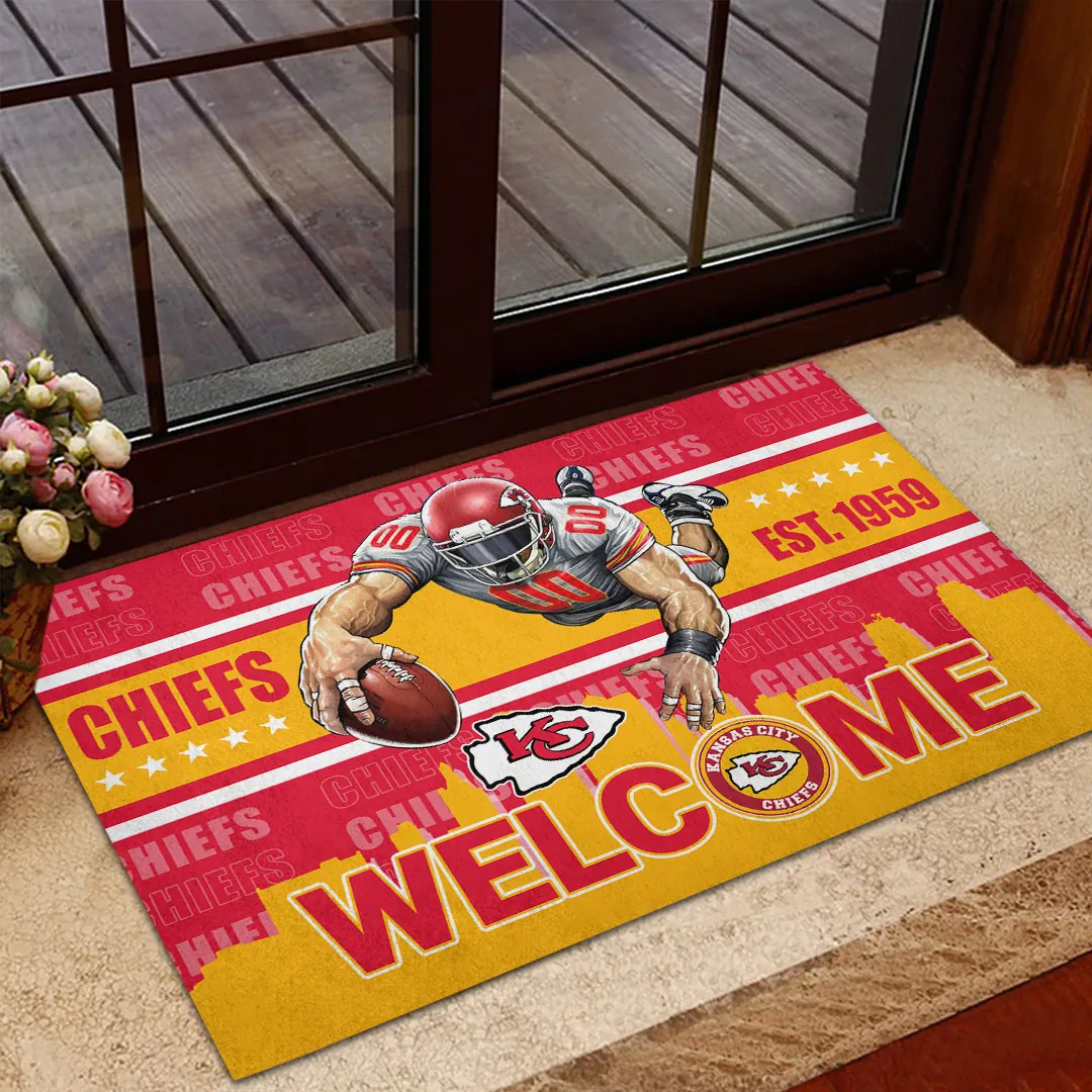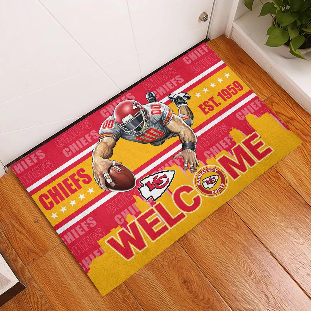 Kick off football time with top-notch celebration by jazzing up your entrance with the Kansas City Chiefs Touchdown Welcome Doormat. Snazzily made and super sturdy, this doormat shows your die-hard support and love for the Chiefs in style. It’s more than just a mat; it’s an emblem of your non-stop team enthusiasm.