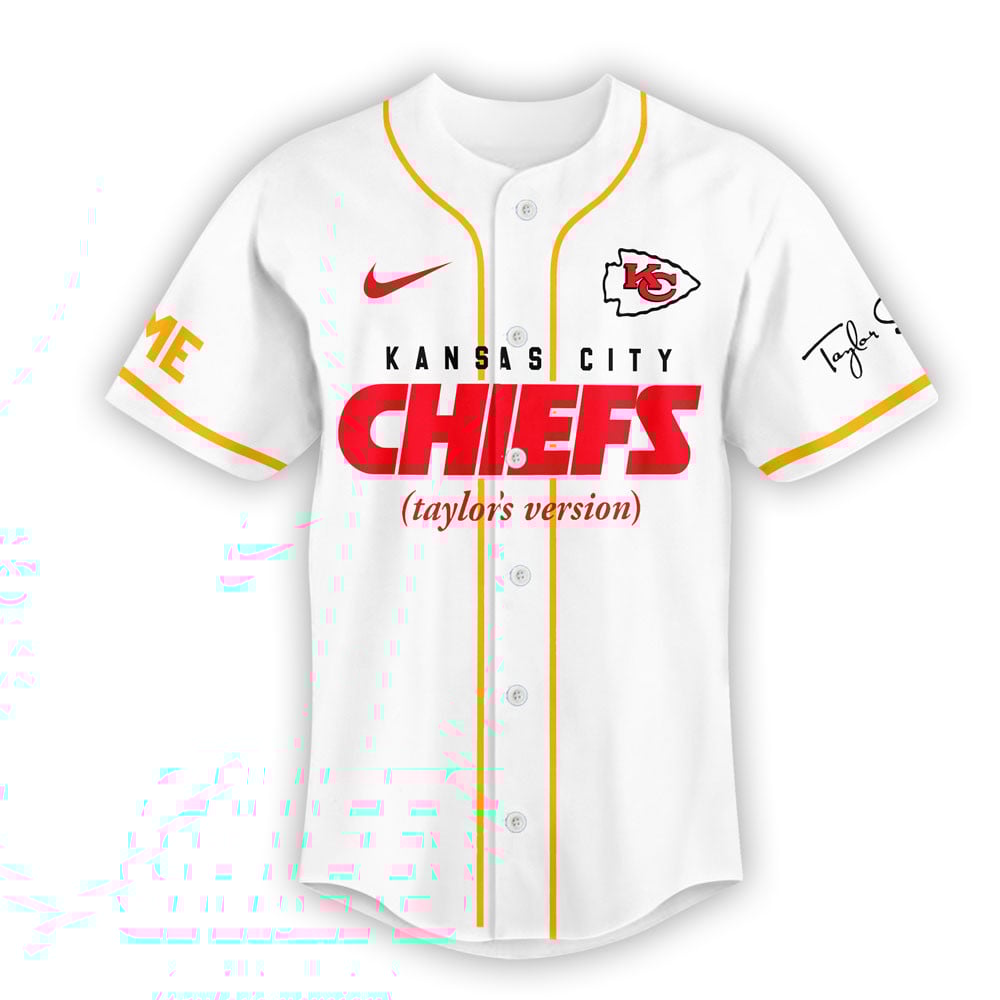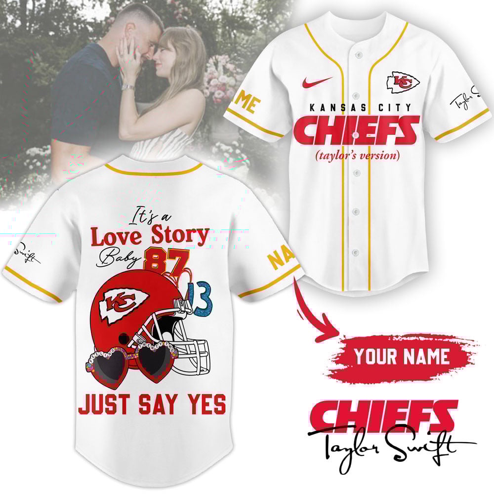 This Taylor Swift Travis Kelce Love Story White Baseball Jersey is all about flaunting your team love in style. The jersey features a regular round neck style, great for daily use or a day at the game. With this special baseball jersey just for you , you can switch up your game-day look or share the Chiefs spirit with a buddy.
